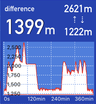 On historical tracks, the largest number displays the ‘difference’ between minimum and maximum, effectively the ski-height range that you have skied. In this case, the label will state ‘difference’ (as in the top image).