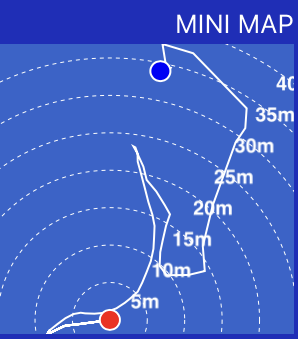 This is a tiny map showing were you have travelled, with all other detail removed for simplicity. When you START a recording, a BLUE dot is placed on the MiniMap. As you then move around your current location is given by the RED dot. Distance lines are always drawn outwards from your current position so you can see how far you are away from other visited areas.